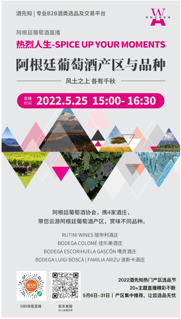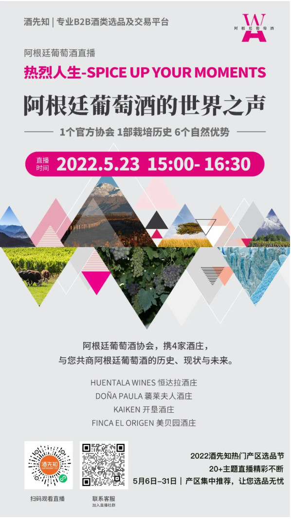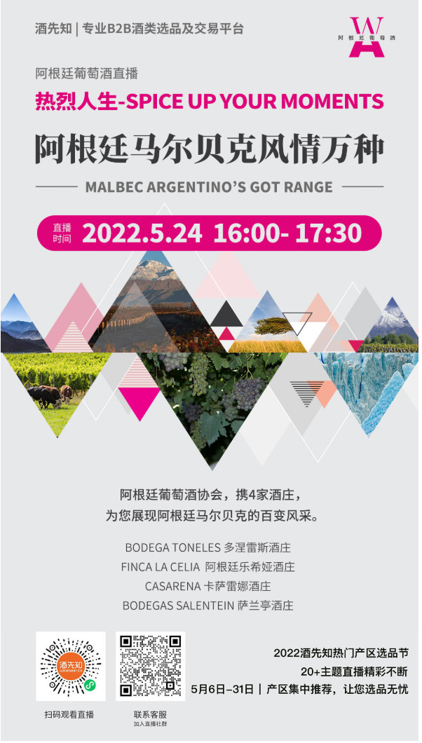 作为阿根廷葡萄酒协会,我们当然希望用阿根廷的国饮——葡萄酒,来庆祝这个伟大的节日。但目前全球疫情仍处在震荡期,受此影响各类葡萄酒展会活动延期举行。因此,我们与专业B2B酒类选品及交易平台“酒先知”达成合作,将于5月23日、24日、25日连续推出三场阿根廷葡萄酒主题直播,邀请12家阿根廷葡萄酒庄,与您分享阿根廷葡萄酒的故事新闻、风土人情,一起徜徉在阿根廷葡萄酒的世界里吧!
