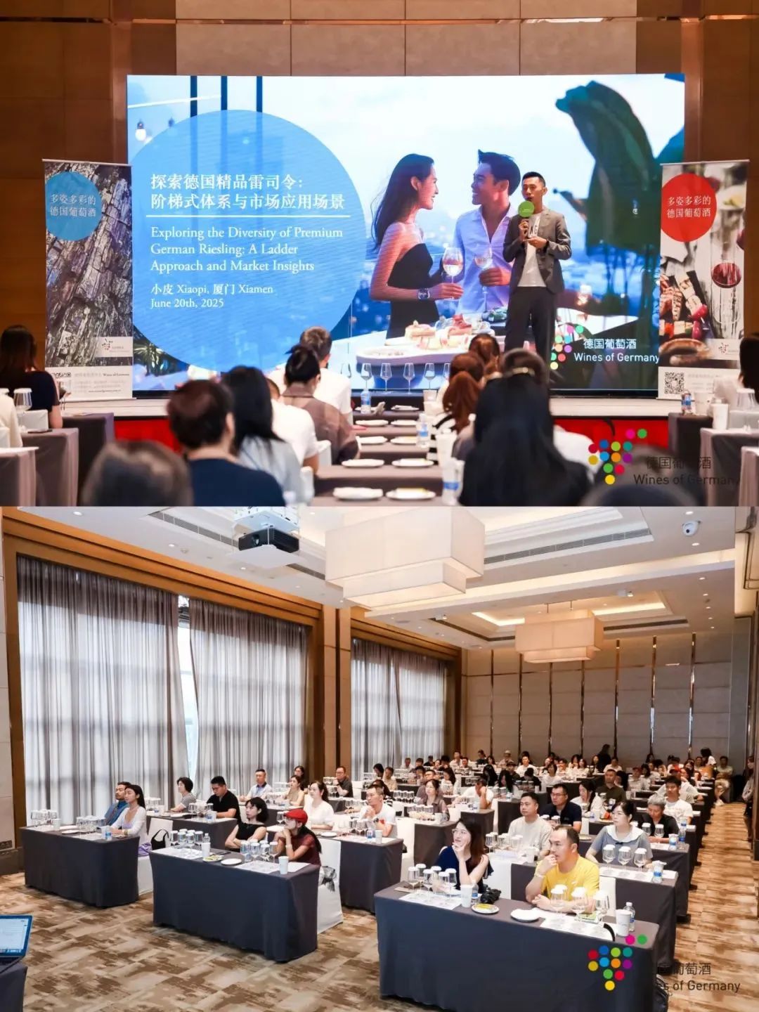 6月广州与厦门巡展,34家德国葡萄酒展商齐聚,共吸引900余位业内人士及资深爱好者莅临参与,聚焦以雷司令为首的德国白葡萄酒,为即将到来的盛夏消费旺季备货;大师班现场座无虚席,由侍酒师大师、知名葡萄酒讲师等大咖坐镇,兼具专业性与趣味性,全方位展示德国雷司令的千面魅力及其他特色红白葡萄酒品种的多样个性。