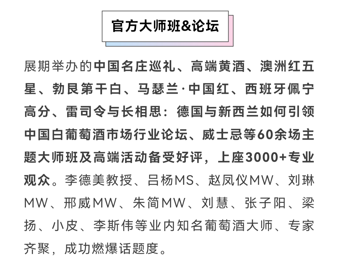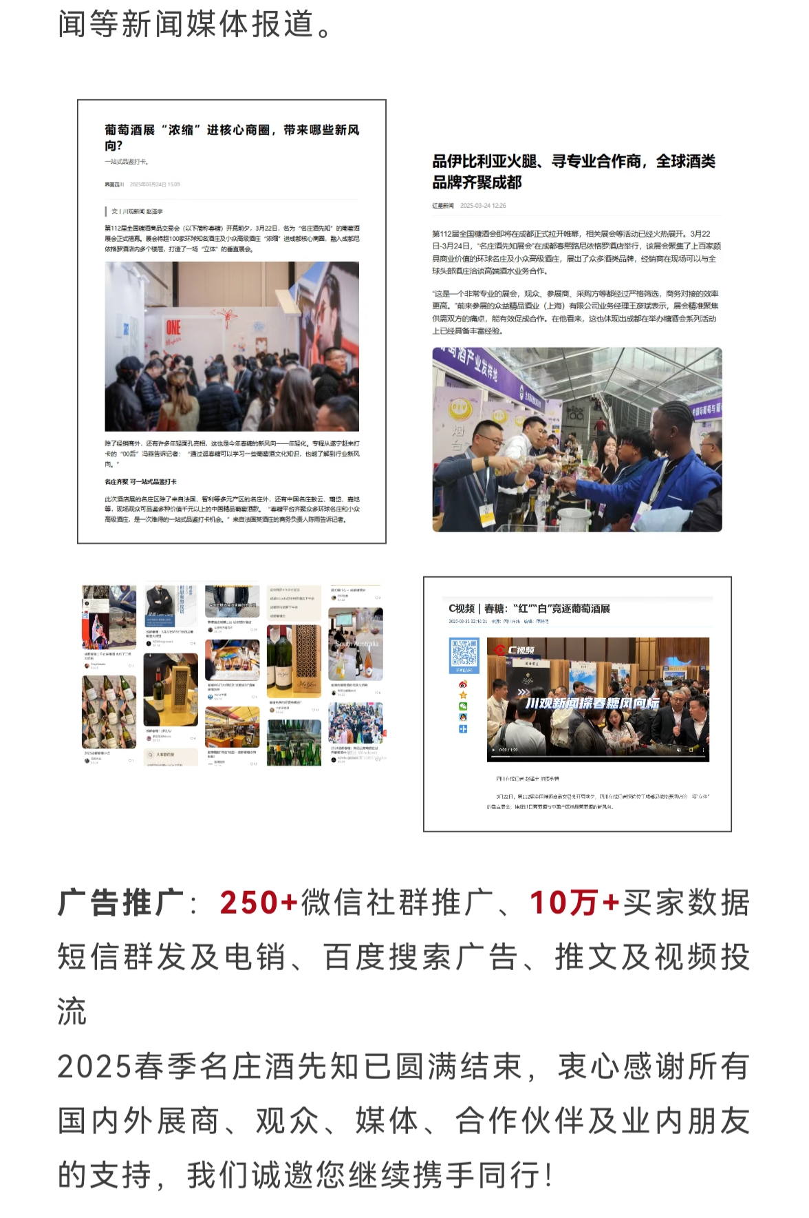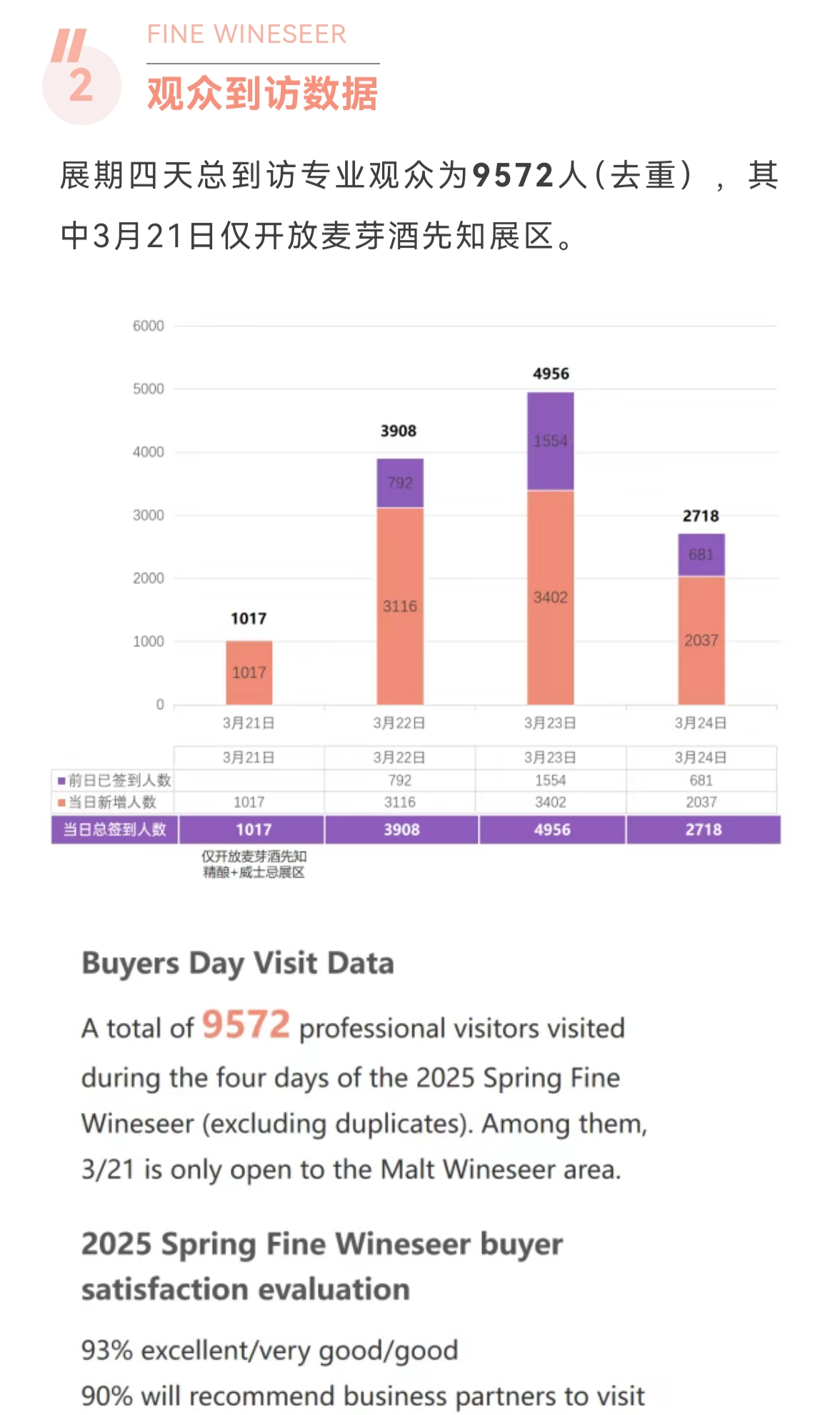 2025年3月21-24日,春季名庄酒先知在成都尼依格罗酒店盛大举办,展期汇聚来自28个国家的17大展团及300+全球名庄和品牌酒商、60+场高端大师班活动,共吸引9572专业观众(去重)到场,94%以上的观众表示出对此次活动的高度认可和好评!